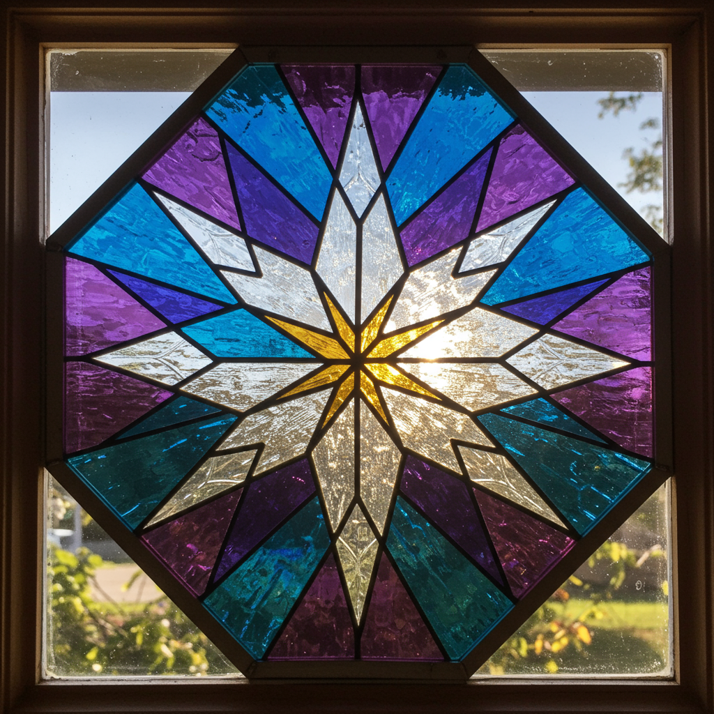 A stained glass window by JoAnne Barbiaux Pohler resides in the bedroom of her Truckee home, photo by Sylas Wright