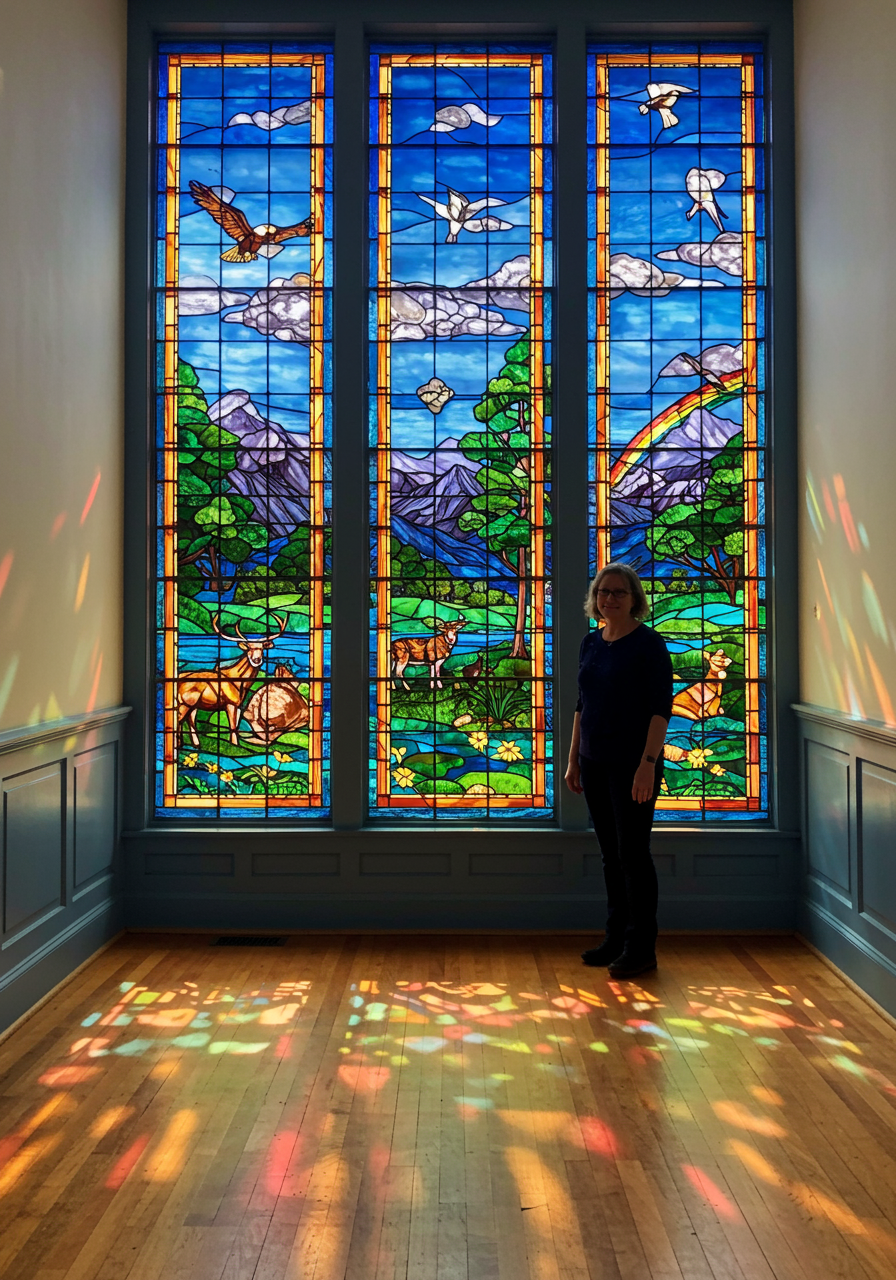 Marjorie Voorhees stands in front of Headwaters, a stained glass artwork she created for the historic Old School House in Loyalton. The piece measures 8 feet by 8 feet and includes 1,400 individual pieces spanning eight panels, courtesy photo