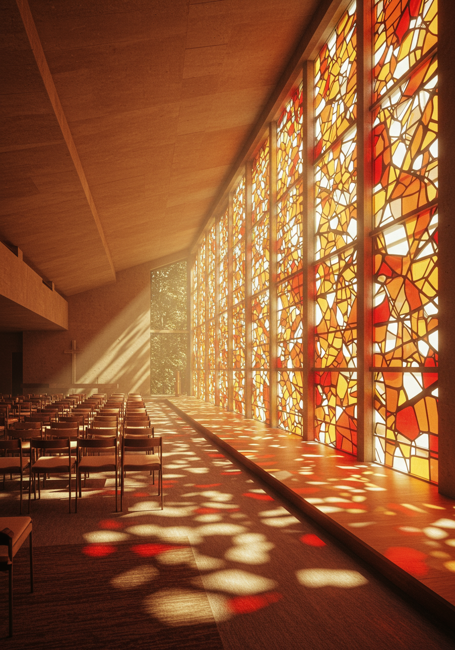 The treasured landmark is a striking innovation in design, right down to the stained glass work by artist Anne Knorr. The windows, which rise from the floor all the way up to the building’s signature roof, occupy three sides, and were constructed using 175 individual panels.