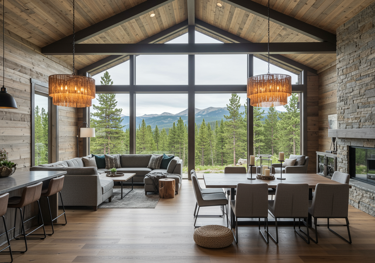 After the house was completed, Vincent says the owners wanted the interiors to be as “bright and sunny as possible.” While great rooms are common features in Martis Camp, this version is special not only for its views, but also for the giant scale of a doorway/wall that opens to the site and brings in natural light.