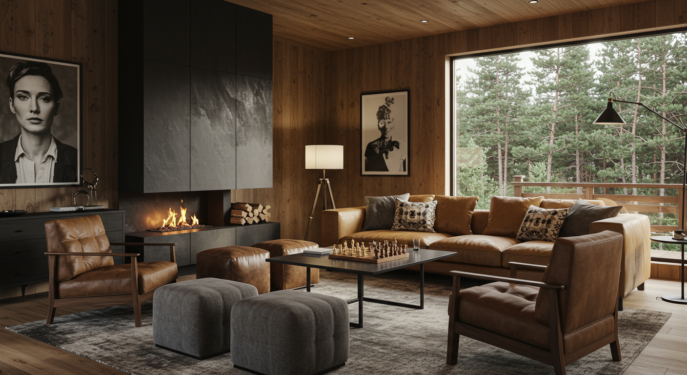 The media/bar room features reclaimed wood and dark, masculine fabrics that provide a warm feel