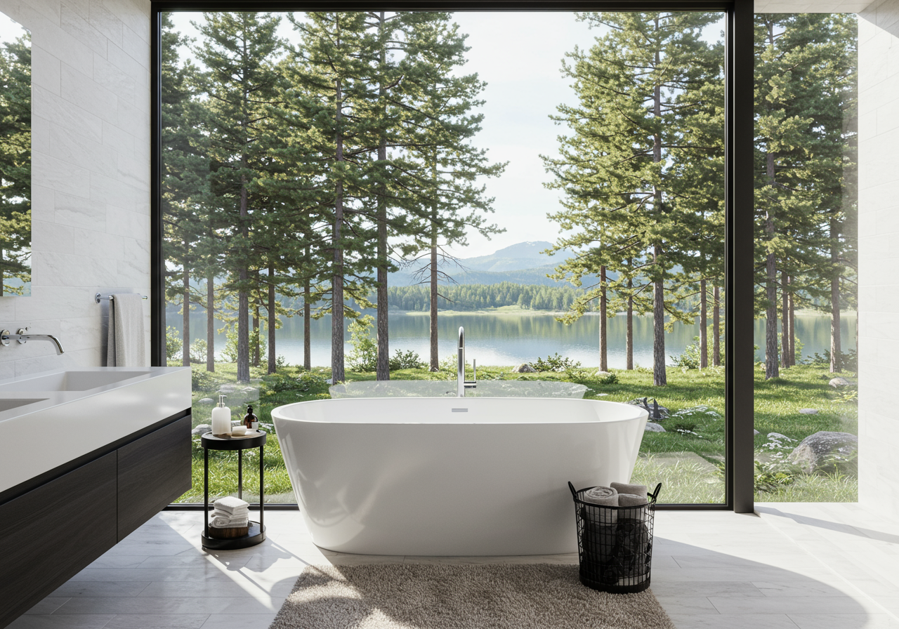 A free-standing tub in the primary bathroom overlooks the water feature and golf course beyond