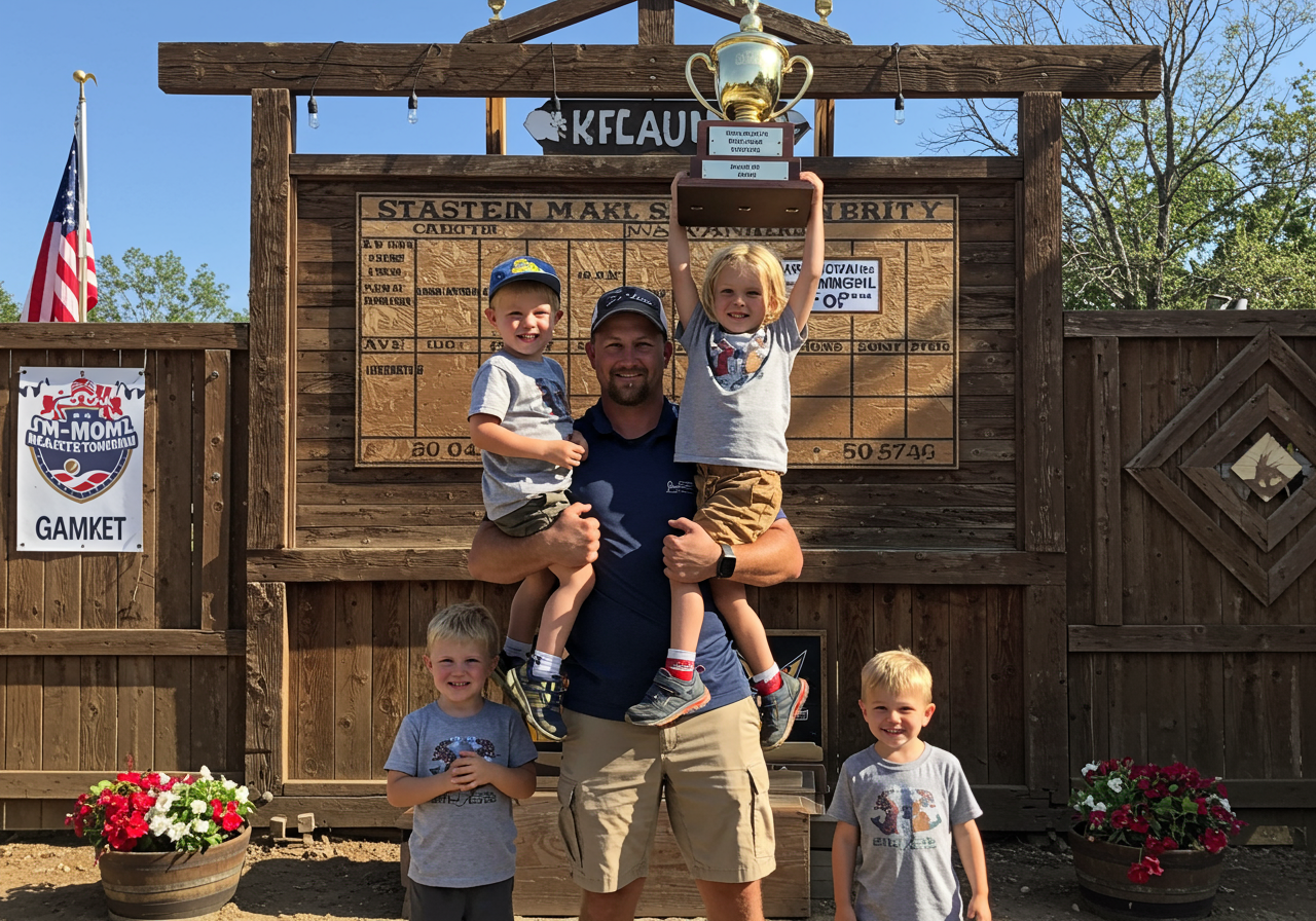 With kids in tow, Zink hoists a well-earned trophy in October 2023, photo by Paris Gore / Red Bull Content Pool
