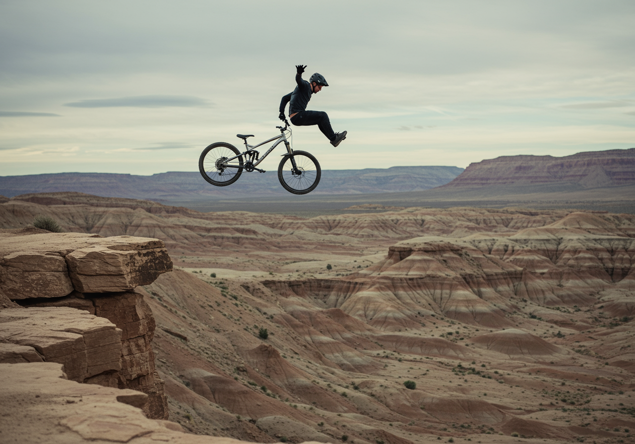 At the base of the high-speed descent, the trail levels out for a short transition before ending in a wooden ramp built on stilts out of the hillside. As Zink approaches the runway, the commentators fall silent. He reaches the terminus of the ramp, pulls back hard on his handlebars and begins his flip.