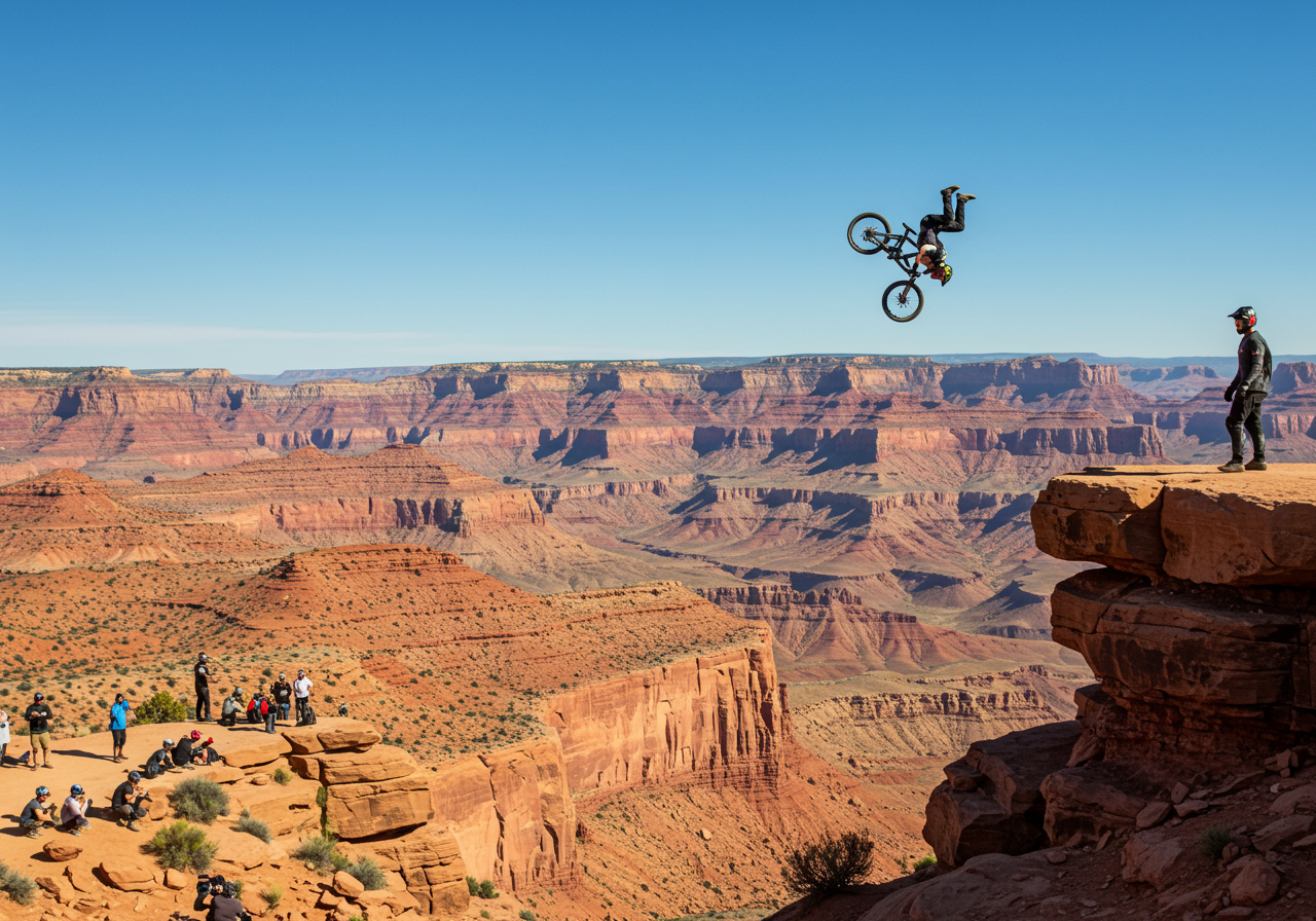 Cam Zink waits at the edge of the cliff, bike ready, helmet strapped. Storm clouds gather along the horizon, nearly eye-level from the top of the fin 1,500 feet above the desert floor. Spectators dot the landscape below.